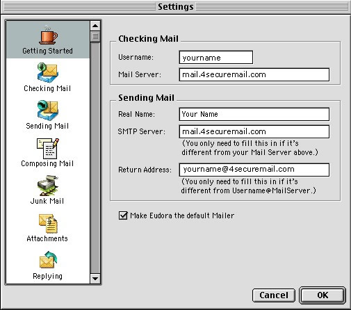 Step 3: Getting Started Configuration The "Settings" box opens with the "Getting Started" menu seletcted. Enter the information as listed in the screenshot below, changing "yourname" to your 4SecureMail user information under "Username" and "Return Address", and "Your Name" to your name under "Real Name." If you wish, you can say "Yes" when asked if Eudora should be the default mail application. This is optional.