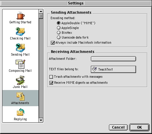 Step 6: Attachments Configuration Click on "Attachments" in the left-hand column. Verify that "AppleDouble ("MIME")" is set under "Encoding method," and that "Always include Macintosh information" is checked.